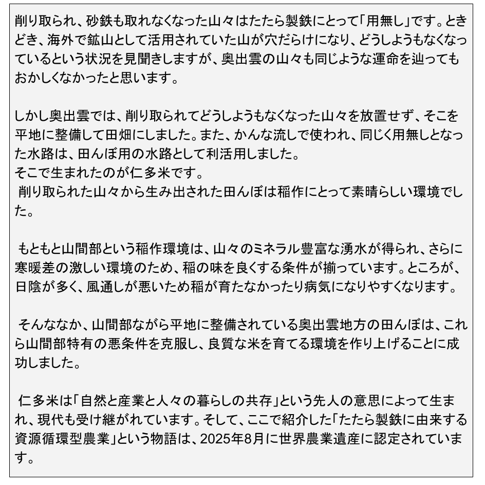 私たちも田植えや稲刈りの時、田んぼの縁で仁多米の塩むすびを食べますが、「おむすびって、こんなに美味しかったかな?」と思うことすらあります。